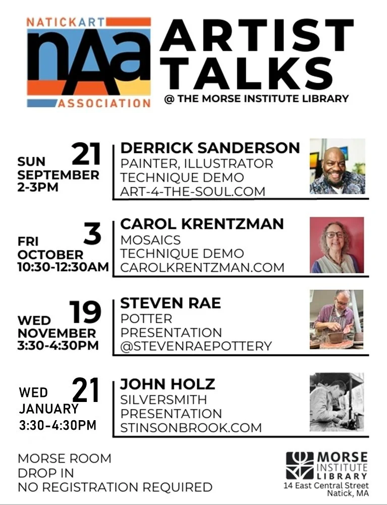 Natick Art Association’s goal is to bring art to our local community by providing opportunities to welcome, foster and encourage ongoing conversations about the experience of creating art and craft. We are here to inspire and cultivate artistic excellence among the members of our creative community and beyond. Members include artists, artisans, makers, art enthusiasts and supporters of the arts.